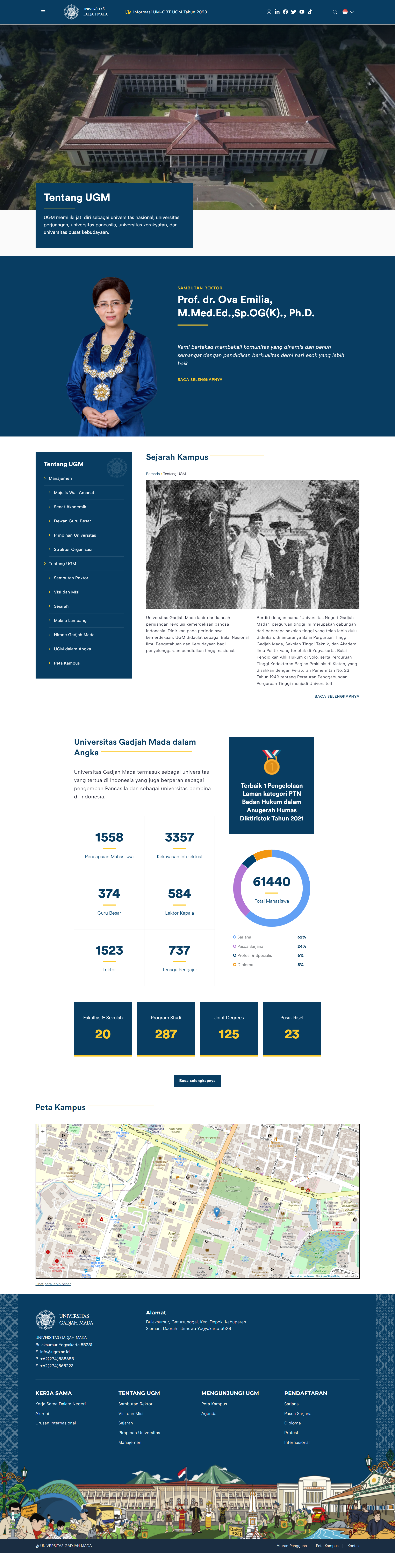 Tongkolspace sebagai perancang website resmi Universitas Gajah Mada ini dengan tampilan yang lebih elegan, modern, serta mudah dinavigasikan untuk kenyamanan pengunjung situs. UI/UX yang ringan namun handal juga sangat membantu pengunjung situs dalam mendapatkan informasi yang dibutuhkan. Kami juga melakukan analisis mendalam sehingga informasi lebih akurat, terpercaya, dan dapat mencerminkan citra Universitas Gadjah Mada dengan baik.Tema website resmi UGM ini juga dirancang secara khusus oleh tim kami untuk menunjukkan ciri khas dari Universitas Gadjah Mada.